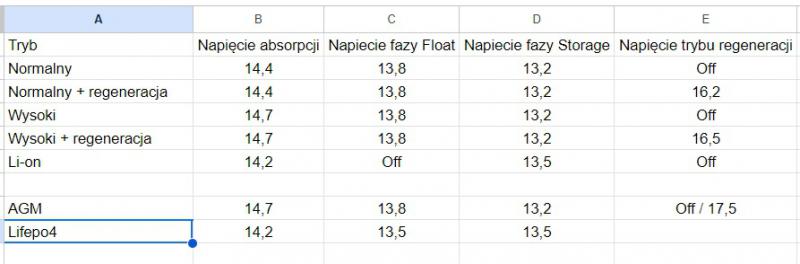 0 Paweł O Opublikowano 15 Września 2024 Zgłoś Udostępnij Opublikowano 15 Września 2024 Gdy nie będę miał apki aby ustawić specjalny program do LiFePo4 to jakich przycisków uzyć? Bo dedykowanego nie ma. Zczytałem nastawy z tych nominalnych (przyciski na ładowarce) i z tych zaawansowanych włączanych z apki.Miałem taki sam problem z AGM jak chciałem szybko włączyć a nie wziąłem tel. do piwnicy.Dlatego jak widać z ustawień:Zawansowany "AGM" = dioda "high"Zawansowany "lifepo4" = dioda "li-ion" 1 Cytuj Odnośnik do komentarza Udostępnij na innych stronach Więcej opcji udostępniania...