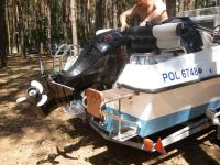 Pytanie co robić dalej? Czy da się to jakoś polepszyć żeby w pojedynkę płynęła bardziej płasko? Zostawić silnik tak odchylony (bardziej już się nie da) i podnieść go do góry. Bawić się w niejakie "trim tabs", czy "celowo" dociążyć przód (z tyłu nic prócz styropnianu już nie ma). A może po prostu ten typ tak ma?