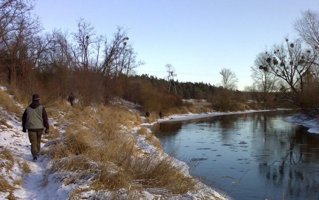 Wedkowaliśmy od mostu autostradowego w dół i w górę rzeki po obu stronach mostu.Ogólnie bardzo ciężkie warunki do łowienia,oblodzone brzegi,płynąca kra,śryz jednym słowem ANTARKTYDA Mimo to widzieliśmy ryby a jak że!Tu za mostem kolega z Warszawy wyholował pięknego samca troci.Ryba wazyła 6kg, potem widziałem jeszcze jednego wędkarza który niósł kelcinę tak na oko do 60cm.Na bierząco zaczeły spływać informacje o złowionych rybach.Poniżej młyna w Łubiczu padło kilka rybek w tym komplet,jedną sztukę i to bardzo dużą wędkarz holował kilka minut,niestety ryba zeszła.Ogólnie mówiło się o ok 20 złowionych rybach w granicach do 65cm poza wspomnianym 6kg samcem troci.Myśle że gdyby nie było lodu i kry ryb było by zdecydowanie więcej