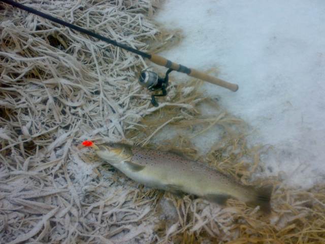 Koledzy mieli kilka delikatnych brań. Widzieliśmy również na wyżej wymienionym odcinku ok. 10 ryb w tym jeden komplet. Łosoś ok. 75 cm i trotka +- 55 cm. Większość ryb oscylowała w granicach 60 cm. Nawisy lodowe przeszkadzają, kra też ale nie na tyle aby nie można było łowić. Już kombinujemy nad kolejną wyprawą.