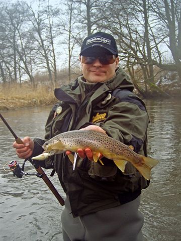 bartek Opublikowano 16 Lutego 2009 Zgłoś Udostępnij Opublikowano 16 Lutego 2009 To cosik napisze.Chyba nie musze mówić jak ogromnie szczęśliwy chodze od soboty!>Pstrągi łowię dopiero trzeci sezon,ale pochłonęły mnie bez reszty! Inne ryby dla mnie nie istnieją.>Ryba wzięłą w dość niepozornym miejscu-ot rynienka pod moim brzegiem,głębokość okoł0 1,2m. Charakterystyczne było to iż powyżej tego miejsca, pod drugim brzegiem uchodzi szeroki rów melioracyjny. Zawsze na początku wiosny jest tam zatrzęsienie żab-mają tam chyba zimowisko. Podejrzewam że nawet zimą co jakiś czas jakąś żabke nurt znosił do stanowiska pstrąga. 2 lata temu w tym samym miejscu kolega spiął ładnego pstrąga, dlatego też za każdym razem kiedy byłem na rybach dokładnie obławiałem to stanowisko i jak widać opłaciło się.Ryba wzięłą na gumę. Używam mocnego kija do 21g,plecionki pp 0,13mm.Walka trwała kilka minut. Cytuj Odnośnik do komentarza Udostępnij na innych stronach Więcej opcji udostępniania...