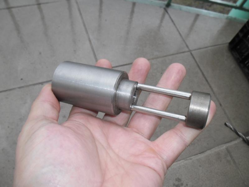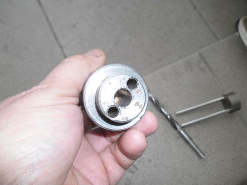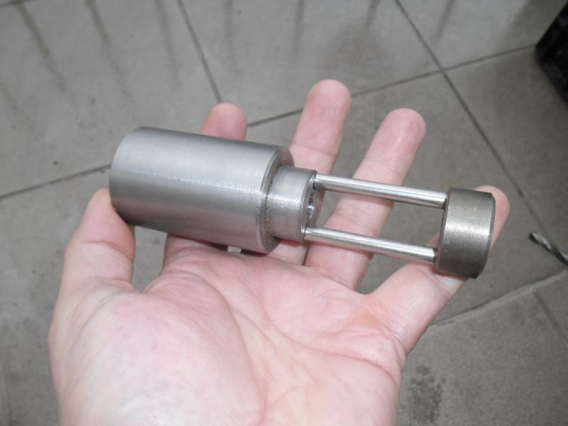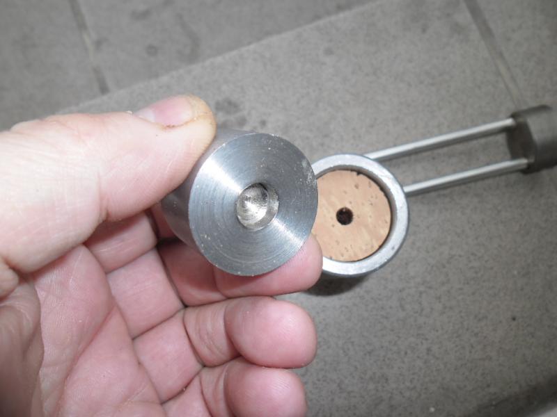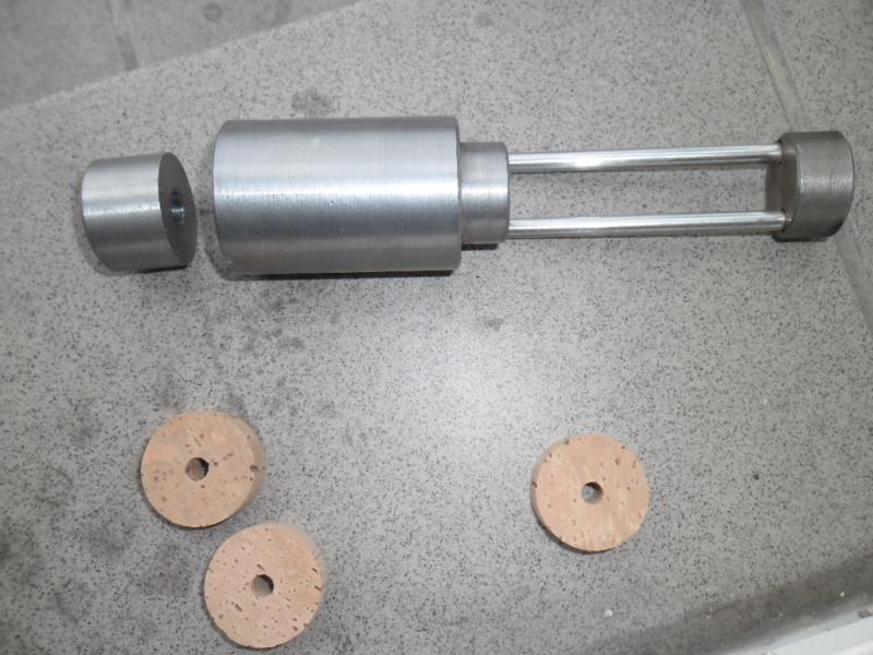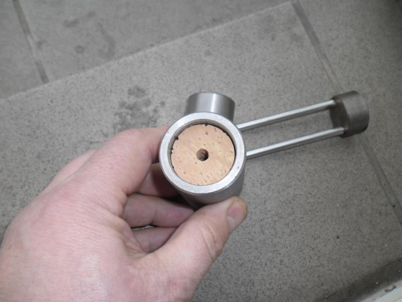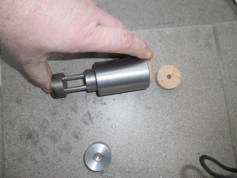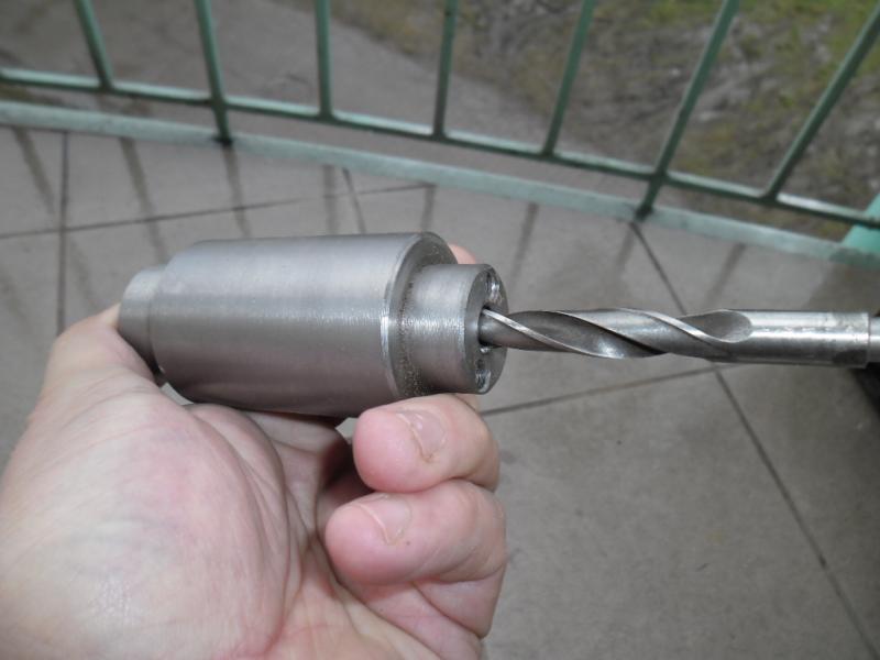Przyrząd do ręcznego rozwiercania(tzn.że nie trzeba imadła żadnych wiertarek stołowych,odbywa się to w rękach,trzeba tylko docisnąć dobrze popychacz i 2800obr/min z ręcznej wiertarki załatwia resztę) korka,pianki,drewna  zaprojektowany i wykonany przeze mnie.Pozwala na rozwiercanie plasterków różnej grubości powiedzmy od 2mm do max 3.9cm bo taka jest długośc tuleji(wchodzą trzy krążki np.korka).Mój przyrządzik przystosowany jest do wiertła 10mm,ponieważ taka średnica jest najbardziej uniwersalna, pewnie z 90% blanków zaczyna się od takiego rozmiaru  wzwyż.Osobiscie prawie wszystkie plastry rozwiercam na 10mm,jest to dla mnie dużym ułatwieniem w późniejszych etapach,np. cięcia na plasterki.Po co ciąć z 7mm otworem dokładając czasu i brzeszczotów jak można zrobić szybciej , taniej i prościej,a poza tym rozwiercanie do blanku zaczynam od średnicy 10mm,również do mixu pianki i korka potrzeba rozwiercenia,najmniejszy otwór w piance jaki miałem to był 3/8.Dl mnie bardzo użyteczne to może i  komuś  będzie pomocne,jest gotowiec,foty poniżej.