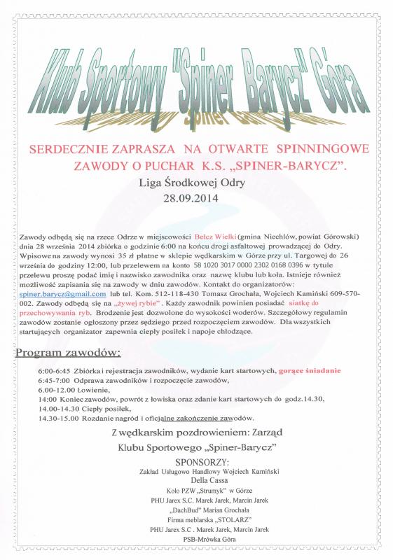 Zaproszenie na zawody K.S. " Spiner Barycz" Liga Środkowej Odry