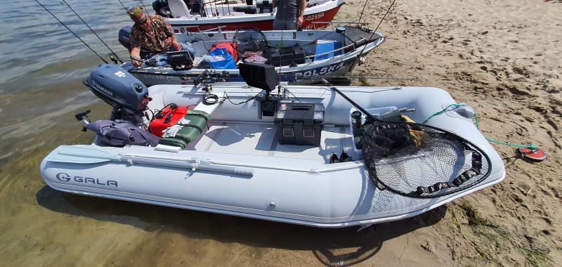 Tak wygląda Gala 330 odpowiednik kolibri DSL zapakowany dla jednej osoby na zawody czyli sprzętu więcej niż potrzeba. Jedna ławka. Paliwo i torba z ciuchami zapasowymi i jedzeniem za plecami. Wędki i echo na burcie. Na środek skrzynka z przynętami, akcesoriami i akumulatorami do echo. Na dziobie pudło na line kotwiczną, gumiaki, koła slipowe, śmieci i wszystko inne co nie ma swojego miejsca. Podbierak na górę. Po środku zostaje miejsce na mierzenie metrowych mamusiek :)
