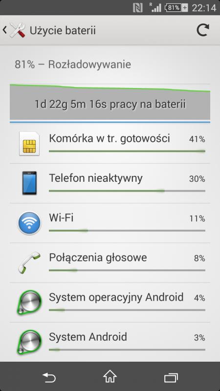wynik rewelacyjny chociaz w realu nie osiagalny. osoby ktore odbiora jakies polaczenie w ciagu dnia,zrobia zdjecie i zajrza do neta wyciagna max 3 dni i bedzie to wynik rewelacyjny. Zaznacze ze sony z1 z2 i z1 compakt byly to jedyne telefony których nie udalo mi sie rozladowac w ciagu jednego dnia. reasumujac z1 compakt to lepszy wybór niz s5mini,mimo ze zdecydowanie wole samsungi