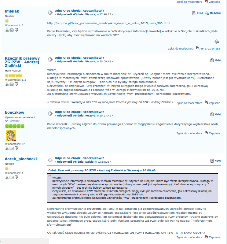 morouk Opublikowano 10 Stycznia 2015 Zgłoś Udostępnij Opublikowano 10 Stycznia 2015 (edytowane) W styczniowym wydaniu WW, które już było wydrukowane w grudniu rzecznik zapierał się, że wędkarze z innych okręgów jesli chcą łowić w OM muszą (!!!) zapłacić w OM wszystkie składki albo płacić okresowe w OM. Tymczasem wczoraj późnym popołudniem na stronach OM zamieszczono informację o (nie) porozumieniach OM w 2015, w której to informacji ten sam rzecznik przeprosił (!!!!!!) za dezinformację. Od wczoraj oficjalne stanowisko jest takie, jak już dawno prezentowane na innych forach i tu: składa członkowska nie w OM, ewentualnie okręgowa - w OM. Warto głośno domagać się swojego Panowie! Ale nie warto spoczywać na laurach. Edytowane 10 Stycznia 2015 przez morouk Cytuj Odnośnik do komentarza Udostępnij na innych stronach Więcej opcji udostępniania...