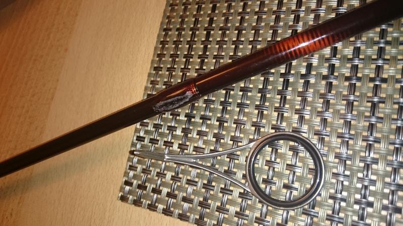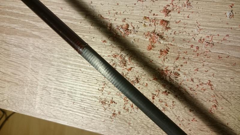 Z kija zdjąłem oryginalne przelotki, które sa bardzo ciężkie i toporne (startowa na podwójnej stopce...). Miejsca po demontażu były niestety widoczne ale trochę pracy papierem ściernym wodnym 2000 i pastą polerską Tempo dały wyśmienity rezultat. Śladu po przelotkach nie ma. Nadmieniam, że blank ma podwopjny oplot krzyżowy i lakier na blanku nie jest idealnie równy.