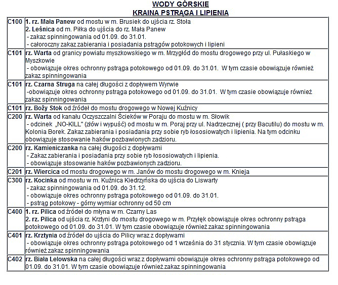 Wykaz wód górskich oraz przepisy szczegółowe dotyczące wędkowania na wodach górskich Okręgu PZW Częstochowa w 2015roku przedstawione poniżej