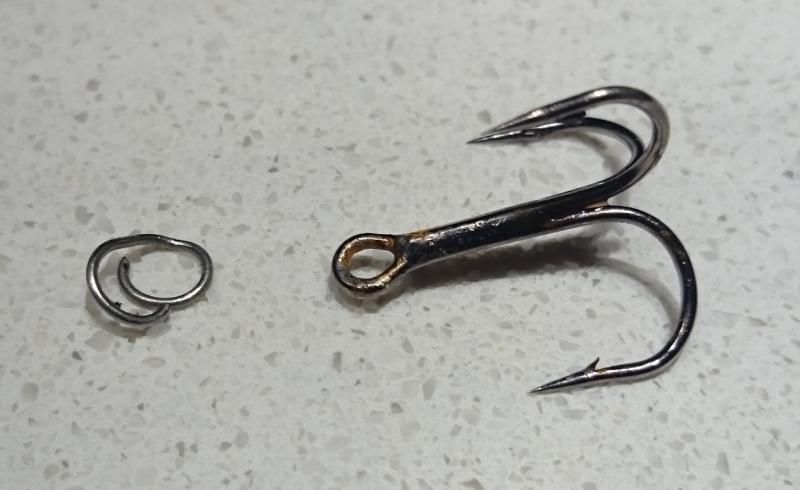 Wczoraj wieczorem udało mi się zapiąć trzy Jaśki, najmniejszy około 32 centymetrów - kolejny z wyraźnymi i wyglądającymi na świeże śladami po ugryzieniu na ogonie. Nie wrzucam fotki bo poniżej minimum forumowego. Kolejne dwa liczyły 40 i 42 cm. Dla ciekawostki dodaję zdjęcie tego co zostało z kółeczka łącznikowego po walce większej sztuki. Nie sądziłem, że te ryby są zdolne do takiej demolki :) Jasiek miał jednak dużo szczęścia - kotwiczka spadła z kółka dopiero w podbieraku a był zapięty za dolną i górną wargę...