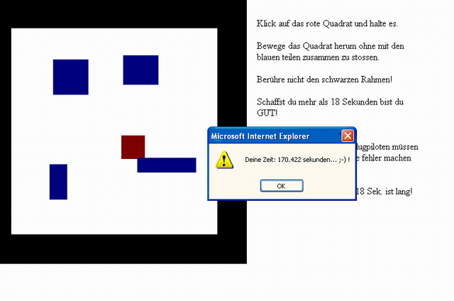 Zasady są proste. Należy schwycić myszą ten czerwony kwadracik w środku i tak go przeciągać by nie dotknąć niebieskich i ścianek pomieszczenia. Jeśli uzyskasz 22 sekundy możesz być z siebie dumny. Podobny test podobno wykorzystywany jest US Air Force - piloci myśliwców.