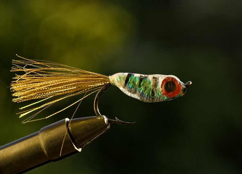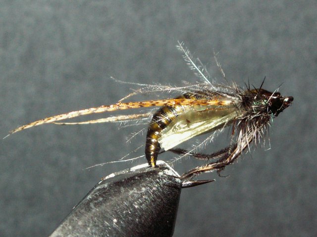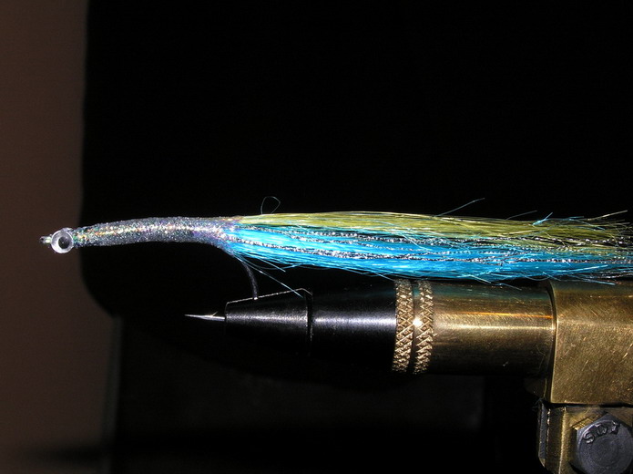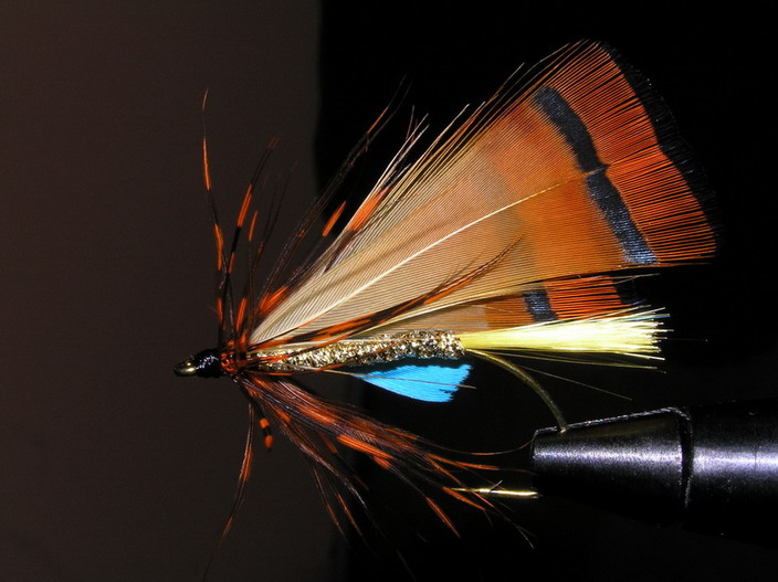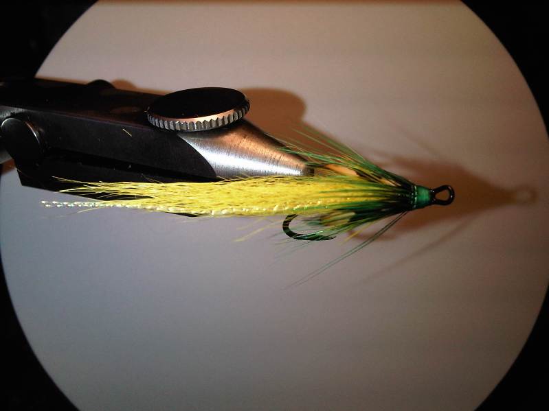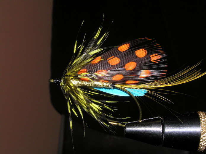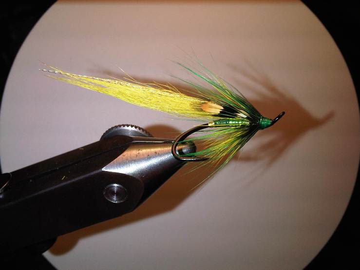 1. Haczyk: Partridge Salar double 9. Nic Roman Moser Silk 12/0, ogonek: zolty arctic runner, flesz, tulow:zlota lameta, metaliczna zgnilo zielona lameta przewinieta dwoma warstwami pearl tinsel, przod: zolty badger, jungle cock, green highlander badger.