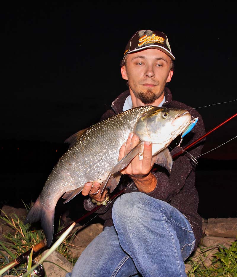 Pszemo Opublikowano 14 Września 2009 Zgłoś Udostępnij Opublikowano 14 Września 2009 Wczoraj wieczorem 2 godzinki nad Wisłą. Ryba była przez chwilę aktywna przy powierzchni później żerowała z toni. Pierwsze branie przy powierzchni, ryba efektownie wyskakuje nad wodę. Niestety tracę mojego wyczekiwanego w tym roku 70+, żyłka nie wytrzymała potwornego uderzenia i pękła. Thrill ma dość poważną wadę, mianowicie przednia kotwiczka plącze się często w żyłkę nie rzadko ją kalecząc co zmusza do przewiązywania przynęty co 30 minut choć jak widać i to nie zawsze pomaga, ale i tak pozostaje moją przynętą nr.1 Kolejne 3 brania w połowie wody niestety nie zacięte, muszę zainwestować w plecionkę do łowienia z opadu Kolega miał 3 brania, w tym jeden zacięty i wyholowany 72 cm. Piękna gruba wczesnojesienna rapa. Piotrek ledwo objął jej kark, a małych rąk nie ma Skusił się na Siudaka prowadzonego w opadzie. O 19 powrót na mecz siatkarzy Cytuj Odnośnik do komentarza Udostępnij na innych stronach Więcej opcji udostępniania...