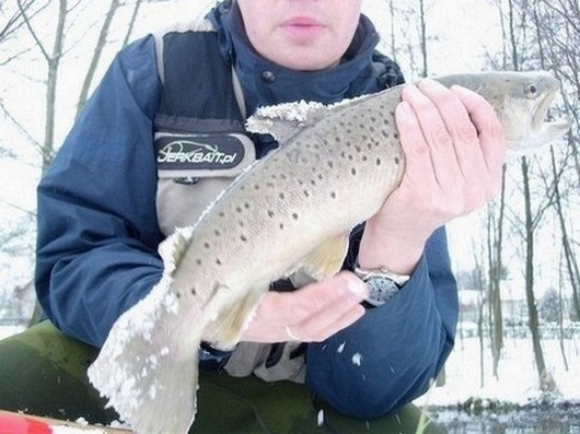 Grzecho Opublikowano 2 Stycznia 2010 Zgłoś Udostępnij Opublikowano 2 Stycznia 2010 Ładnie połowiłeś @ŁukaszGD gratulacje.Ja dzisiaj miałem więcej szczęścia niż wczoraj. Pod koniec łowienia miałem pod samymi nogami wyjście dużego potoka, ale nie zaatakował woblera Minnowa 7 cm T. Oceniłem go na ok. 45cm. Twardo łowiłem w tym miejscu. Po kilku rzutach znowu wyszedł tym razem trochę dalej, ale znowu nie zaatakował przynęty. Zmieniłem Minnowa na Executora IEX7SR – RTR i przywalił. Trochę powalczył, głównie młynkując i chlapiąc po powierzchni, było sporo emocji . Musiałem wejść do wody po stromym brzegu, żeby go podebrać. Bałem się o żyłkę, bo w trakcie walki okręcił ją sobie wokół karku. W końcu jednak szczęśliwie wylądował w podbieraku. Miarka pokazała 47cm !!! Jest nowa życiówka, wiec pozwoliłem sobie na więcej fotek Wiem, że ich jakość delikatnie mówiąc nie powala, jednak to moje pierwsze próby z samowyzwalaczem. . Cytuj Odnośnik do komentarza Udostępnij na innych stronach Więcej opcji udostępniania...