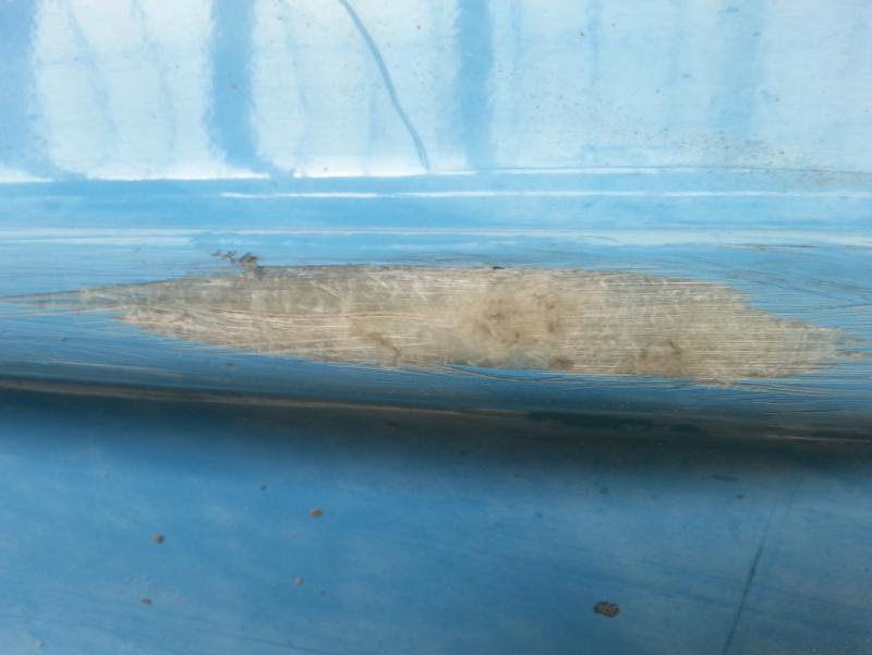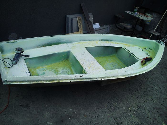 Ze zdjęcia widać, że zdarty jest tylko żelkot ...wystarczy przeszlifować, odtłuścić acetonem i pomalować topkotem i na kilak lat spokój, lub......... nic nie robić o ile łódka będzie wożona na przyczepie a nie będzie stała na wodzie to laminat nie zdąży nasiąknąć.