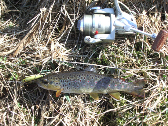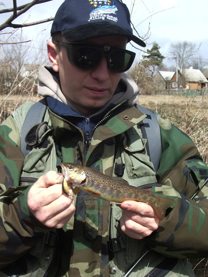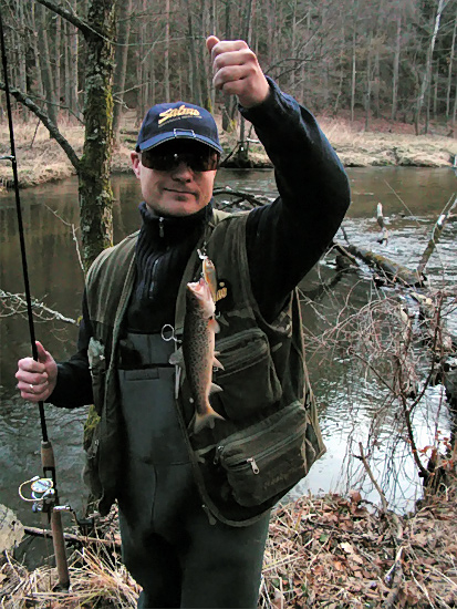 Wczoraj odwiedziłem moją pstrągową rzeczkę.Niestety krótko po rozpoczęciu łowienia wyszło słonko a że woda piekielnie niska to obawiałem się o wyniki :wacko: .Ale nie było tak źle wyjąłem 3 pstrązki w tym jednego wymiarszczaka i miałem jeszcze 5 brań.Ryby słabo brały,wszystkie trzy były zapięte na zewnątrz pyska za skórkę.