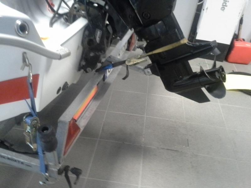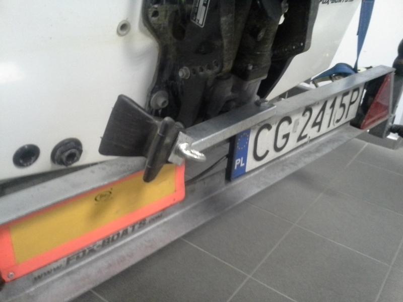 To jest zwykła podpora z zakończeniem z dziobnicy gumowej od przyczepy podłodziowej przykręcona bo belki świateł (mocnej stalowej) i wszystko spięte pasem. Nie chciałem wozić silnika całkowicie podniesionego do góry na maxa na fabrycznej blokadzie górnego położenia bo jakoś za mocno wystaje do tyłu. Dawniej jak miałem inną łódkę i przyczepę bez podpory to wkładałem w mechanizm klocek drewniany odpowiedniej grubości i ściskałem go na trymie i też było OK.