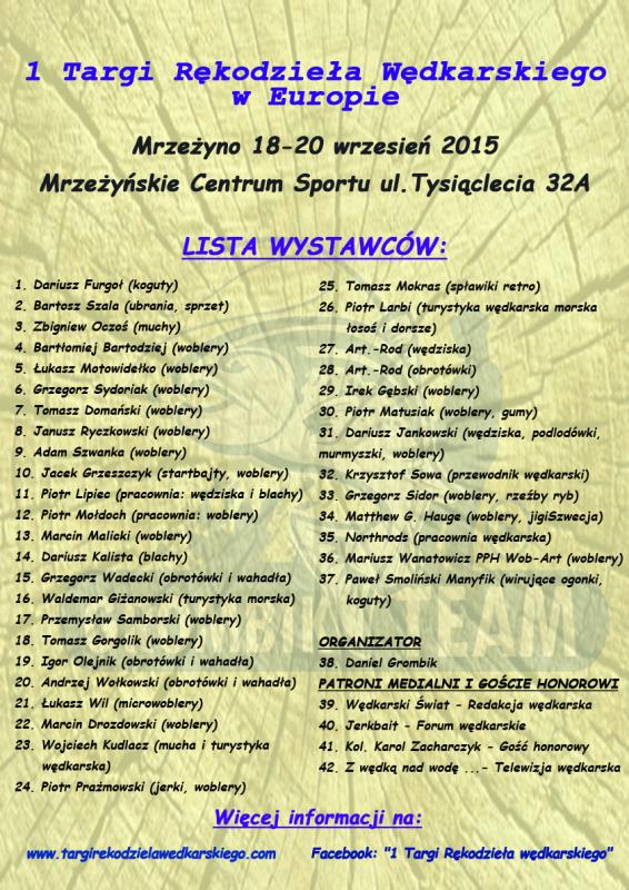 danielg Opublikowano 11 Sierpnia 2015 Autor Zgłoś Udostępnij Opublikowano 11 Sierpnia 2015 Witam Koledzy. Przyjmuję minusa za preparowanie ryb, niesmaczne ale to jednak sztuka.Na szczęście nikt się nie zglosił w tej kategorii.Wpisując w tematykę "Trofea Wędkarskie" - miałem na myśli nagrody dla wędkarzy, rzeżbione, klejone, kute itp. Bardzo Was proszę jak możecie mi pomóc zapraszać waszych znajomych, w kązdej sytuacji i w pogadankach będe bardzo wdzięczny.Zapraszam koledzy do zwiększenia aktywności w dyskusji tematu. Przedstawiam Wan nową wersję ulotki której 20 000sztuk pojedzie za tydzień w Polskę Cytuj Odnośnik do komentarza Udostępnij na innych stronach Więcej opcji udostępniania...