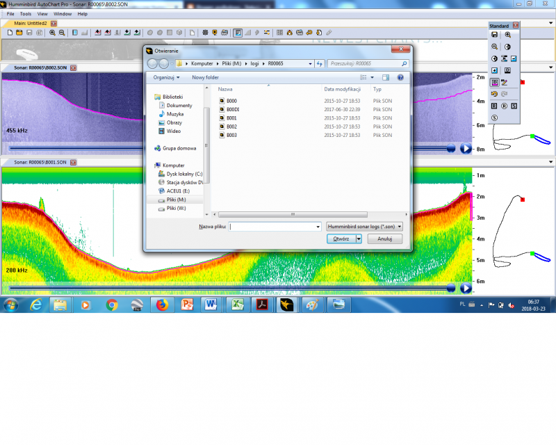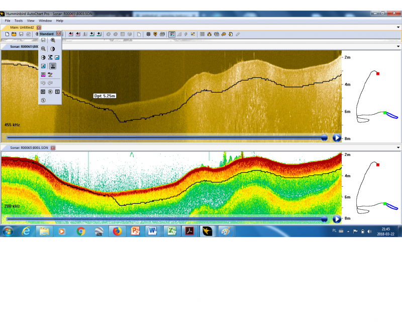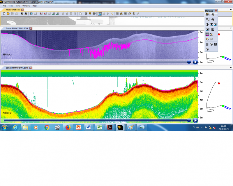 Czarna linia to głębokość wykreślona na dnie oryginalna. Masz dwa widoki 455khz(czyli widoki z kanału SI) -  pliki .son B002 i B003, z których otworzyłem B002.