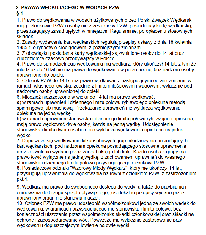 explorator73 Opublikowano 18 Kwietnia 2006 Zgłoś Udostępnij Opublikowano 18 Kwietnia 2006 Poniżej fragment paragrafu 1, który dotyczy osób małoletnich: 2. Kartę wędkarską może otrzymać osoba, która ukończyła 14 lat i spełnia wymogi ustawy o rybactwie śródlądowym.3. Z obowiązku posiadania karty wędkarskiej są zwolnione osoby do 14 lat oraz cudzoziemcy czasowo przebywający w Polsce.4. Prawo do samodzielnego wędkowania ma wędkarz, który ukończył 14 lat, z tym, że młodzieży do 16 lat nie zezwala się na wędkowanie w porze nocnej bez opieki osoby pełnoletniej.5. Członek PZW do 14 lat może wędkować w ramach własnego łowiska, zgodnie z limitem ilościowym i wagowym, wyłącznie pod opieką osoby pełnoletniej posiadającej uprawnienia do wędkowania.6. W ramach uprawnień i dziennego limitu połowu ryb swojego opiekuna członek uczestnik do 14 lat może łowić metodą spinningową lub muchową. Przekazanie uprawnień wyklucza wędkowanie opiekuna.Pozdrawiam,P. Cytuj Odnośnik do komentarza Udostępnij na innych stronach Więcej opcji udostępniania...