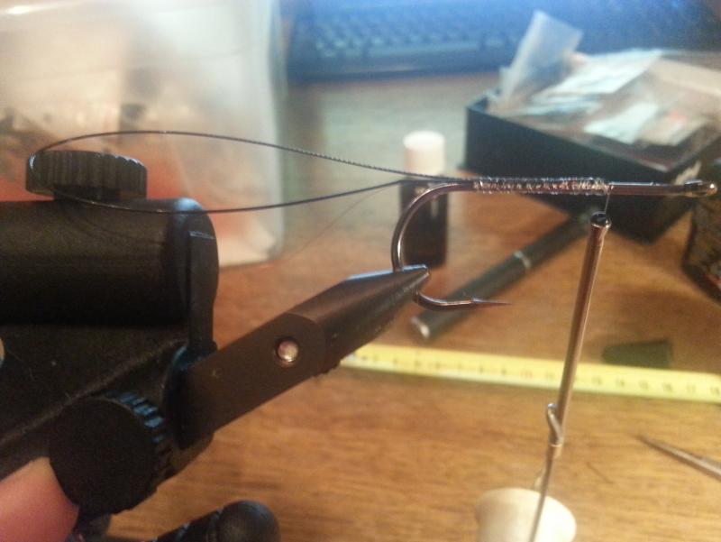 1. Mocujemy hak w imadle, nawijamy nić (w tym przypadku nić żyłkowa). Dodana pętla z drutu żeby doczepić drugi hak z flashem, piórami czy wiggle tail. Dzięki temu możemy przerobić muchę szybko nad wodą.