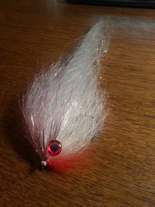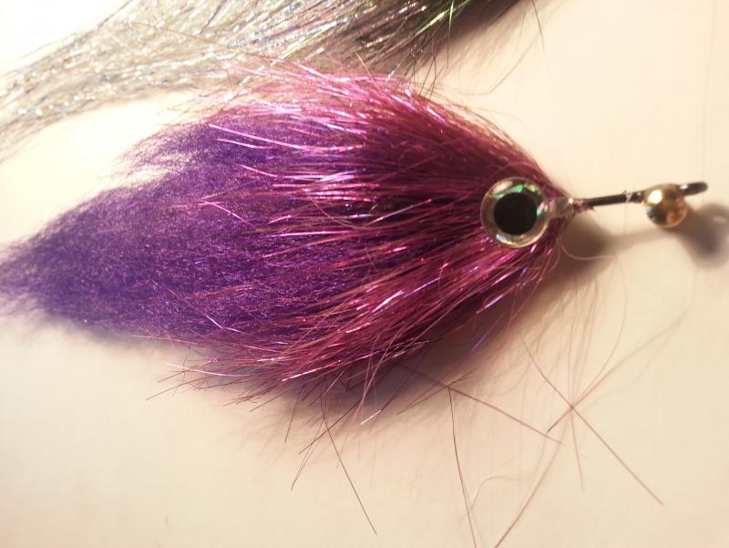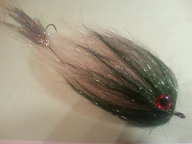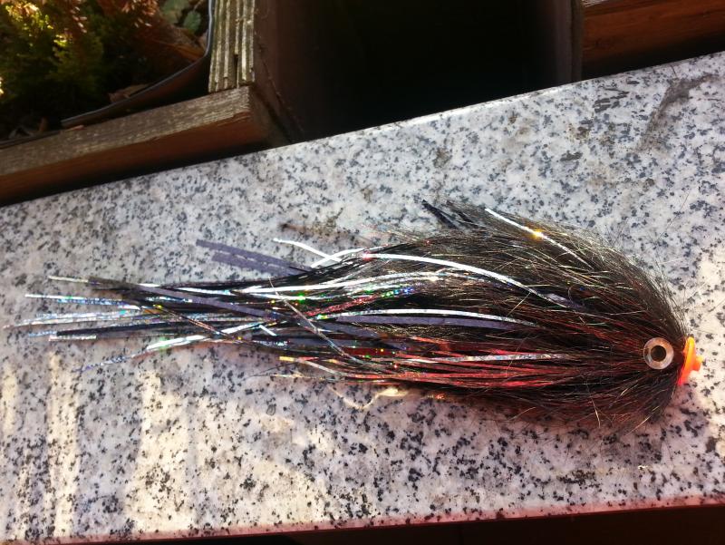 A tutaj coś dużego, bardzo dużego :). Tułów z Flashabou magnum (srebrny holo + czarny holo), z przodu snow runner + optic flash. 35cm czyli poważna mucha na poważne ryby, z przodu dodany talerzyk, który ma trochę zmienić pracę przynęty.
