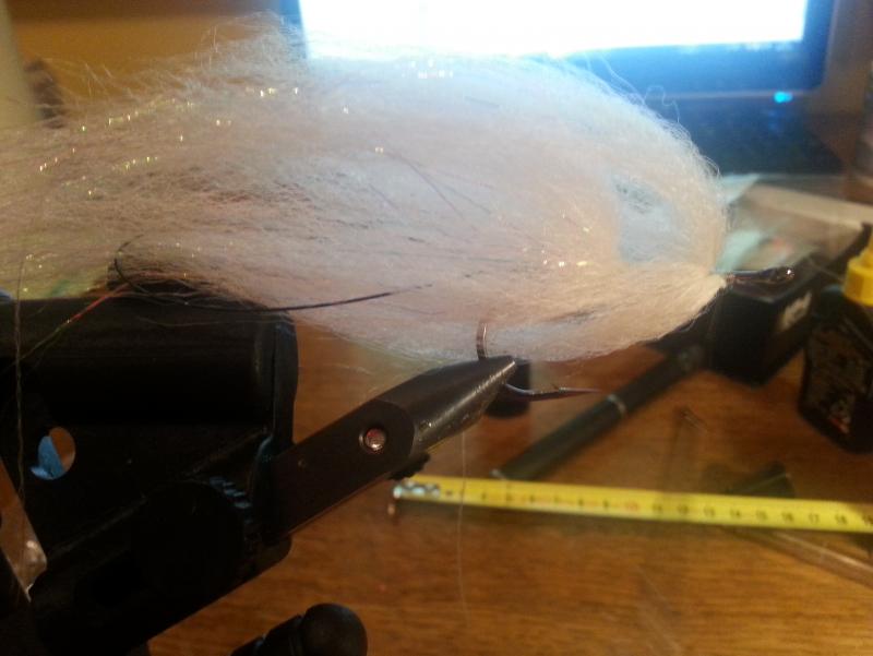 4. Dodajemy trochę flashy - w moim przypadku polarflash perłowy. Flash powinien być dłuższy od włosów, wtedy mucha ładnie optycznie wygląda.