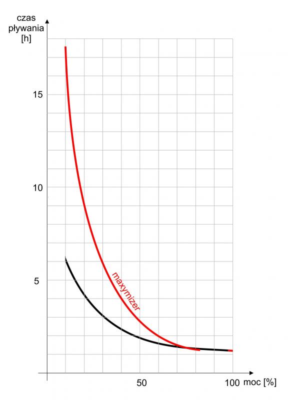 Podsumowując, do trolingu lepszy maksymizer, do pływania w miarę szybko lepiej większy akumulator, ale nawet bez niego dużo nie tracimy nie mając maksymizera.