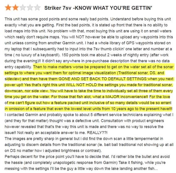 0 bierjoza Opublikowano 6 Września 2016 Zgłoś Udostępnij Opublikowano 6 Września 2016 (edytowane) Czy ktoś z użytkowników moze sie do tego odnieść??? Czy prawdą jest ze Striker'y maja wadę i nie zapamietują ustawień i po właczeniu wracaja ode do ustawień początkowych??i nie mozna nic poradzić bo urządzenia te ze wzgledu na brak slotu kart pamięci nie maja mozliwości aktualizacji oprogramowania??ponizej info z US: PLEASE BE AWARE that Garmin Striker has a major software issue that is showing up on consumer reviews! If you dial in the sonar setting to your liking and turn off the unit, when you power it back on, the settings will be back to defaults. In short, it is not saving the users sonar settings. Also this unit as you know has no chart card door to update the software so expect this issue to be around for a while. Worth reading the full review to see other common complaints. Please see below review: Edytowane 6 Września 2016 przez bierjoza Cytuj Odnośnik do komentarza Udostępnij na innych stronach Więcej opcji udostępniania...
