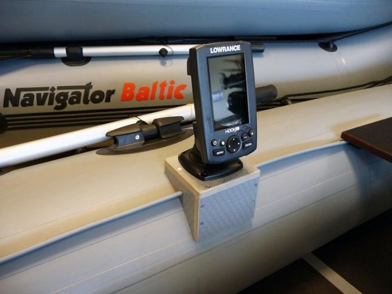 W miejsce kółka z prawej strony wkładam w uchwyt  przetwornik echosondy montowany na dorobionym stelażu, drugi uchwyt wykorzystywany jest do kotwicy. Wykonałem stojak  wyposażony w rolkę i  zaczep do wiązania linki kotwicy wkładany w uchwyt  kółka.