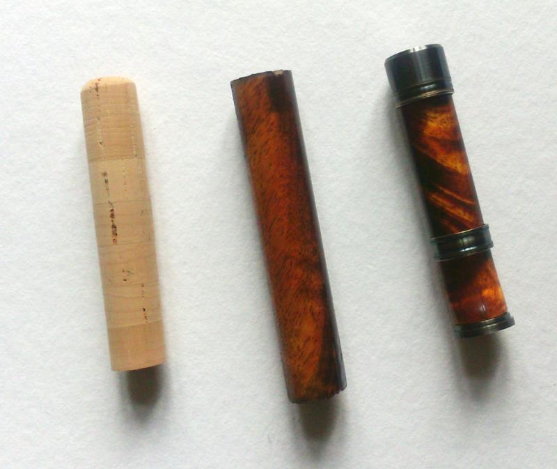 randomrodmaker Opublikowano 20 Czerwca 2016 Zgłoś Udostępnij Opublikowano 20 Czerwca 2016 Pewnie kijek pójdzie pod młotek na ebay, bo mam koncepcje na kolejne i chcę podnosić umiejętności.Ten blank ma genialny kolor, sporo białego pigmentu, co jest kluczowe przy użyciu prześwitującego jedwabiu.Biały Epic też ma ładny kolor, niestety z pewnych powodów nie mogę go zaprezentować.Rozważałem kilka koncepcji uchwytu coś tam sprowadziłem, popatrzyłem, zwróciłem.Komponenty na zdjęciach, a w realu to różne historie...Na focie od lewej, insert flor do wersji z uchwytem typu garrison, i ten ma otwór pod Kabuto.W środku drewno koa do rzeźbienia.Po prawej uchwyt od Raya Lee, który pierwotnie chciałem użyć do Kabuto.Niestety w trakcie powiększania otworu kawałek końcówki mi pękł i musiałem go skrócić. Wykorzystam do delikatnej węglówki, bo naprawdę cieszy oko to drewienko.Kabuto mają dość szeroki dolnik. Cytuj Odnośnik do komentarza Udostępnij na innych stronach Więcej opcji udostępniania...