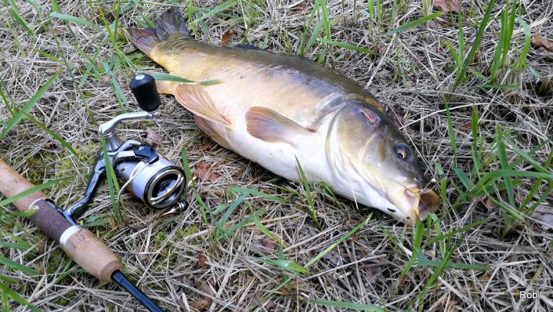 A jak łowią przynęty Marcina to zobaczcie sami  :D Dzisiejszy przyłów na microjiga przy okazji łowienia wzdręg. Karpik ok 50 cm. Dał mi trochę popalić  B) Linka  varivas Mebaru Gate Nylon 2 lb. Dodatkowo ochrzciłem świeży zakup od kolegi z jerka,  graphiteleader bellezza Ex do 6 gram - stworzona do łowienia microjigami.