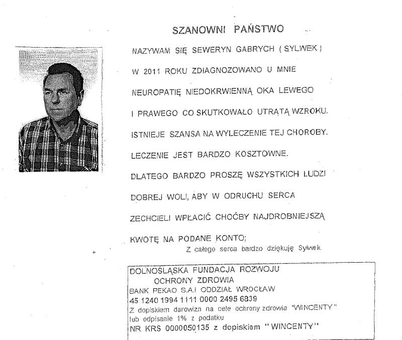 Tak jak możecie przeczytać na skanie, Sylwek utracił wzrok a teraz zbiera na kosztowną operację w Indiach, która pomoże (są na to duże szanse) mu ten wzrok przywrócić.