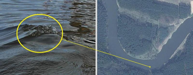 2. Na zielono zakreślony obszar o mniej wartkim nurcie, po lewej od niego mały warkoczyk powstały za kawałkiem zatopionego drzewa. Jak odczytalibyście dno w zaznaczonym miejscu?