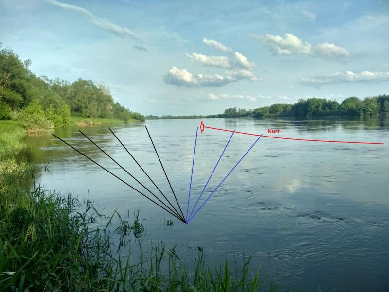 Mam prośbę do kolegów o ocenę miejscówki i poprawności rzutów w szukaniu boleni. Jak widać czerwona linia wyznacza linię głównego nurtu. Woda podniesiona. Czarne to tory podawania przynęty. Czy tory niebieskie są również poprawne czy stosować tylko te oznaczone na czarno. Jak widać po lewej stronie głównego nurtu tworzą się wiry i zwary a im bliżej trawy tym nurt spokojniejszy. Miejscówka intuicyjnie wydała mi się ciekawa pod względem obecności bolenia - niestety żadnego nie udało mi się przechytrzyć. Czy dobrze typuje miejscówki pod bolenia?