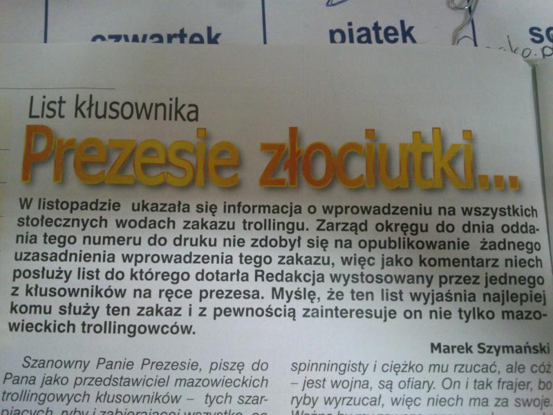 spinnerman Opublikowano 13 Grudnia 2016 Zgłoś Udostępnij Opublikowano 13 Grudnia 2016 W styczniowym numerze WŚ, list klusola do pana prezesa. Ubaw po pachy ))) Niestety ukazuje też przyszłe skutki absurdalnej decyzji o zakazie trollingu w OM.Brawo Marek. 1 Cytuj Odnośnik do komentarza Udostępnij na innych stronach Więcej opcji udostępniania...