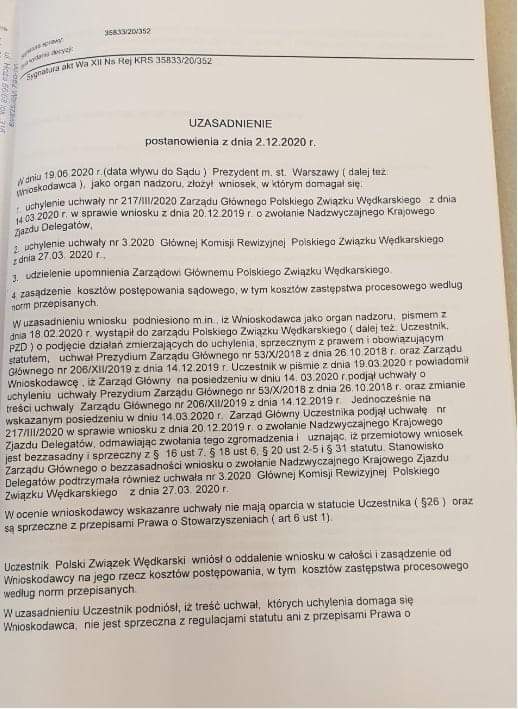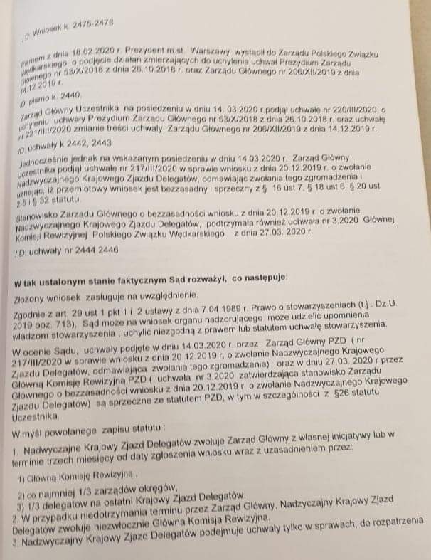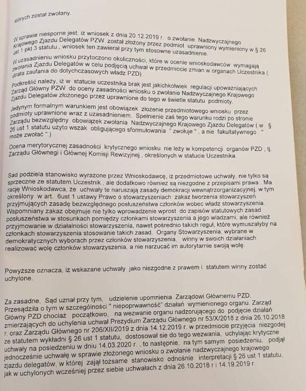 vako Opublikowano 14 Marca 2021 Zgłoś Udostępnij Opublikowano 14 Marca 2021 (edytowane) To proste.Celem OM i spółki było doprowadzenie przed końcem obecnej kadencji do zjazdu nadzwyczajnego, zmiany Prezesa, ZG, GKR, GKS na sobie właściwy oraz (być może) zmiana ordynacji wyborczej na kadencję '21-'24 - na taką jaka była poprzednio(minimum 5 letni staż we władzach by zostać delegatem na zjazd okręgowy i główny). Żaden z tych celów nie został osiągnięty. Stąd klęska na całej linii.Wyrok sądu (jeśli się wczytać) nie nakazuje ZG zwołanie natychmiast zjazdu nadzwyczajnego(bo nie może ze względu na pandemię korono wirusa i rozporządzenia rządowe dotyczące stowarzyszeń), nie zawiesza władz centralnych za podjęcie uchwały nie zgodnej ze statutem, nie wprowadza komisarza zamiast urzędującego Prezesa Rudnika oraz nie uchyla kontrowersyjnych uchwał dotyczących zawieszenia Prezesa i ZOM. Zupełnie odwrotnie jest w OM. Prezes i Zarząd zawieszone w czynnościach, trwa audyt finansowy(kontrola). No to kto tu jest wygranym? PS. Z przeszłości wiadomo, że historię zawsze piszą zwycięzcy. Wyrok sądu może w przyszłości posłużyć za kanwę do rozliczeń ale też nie musi. Edytowane 14 Marca 2021 przez vako Cytuj Odnośnik do komentarza Udostępnij na innych stronach Więcej opcji udostępniania...