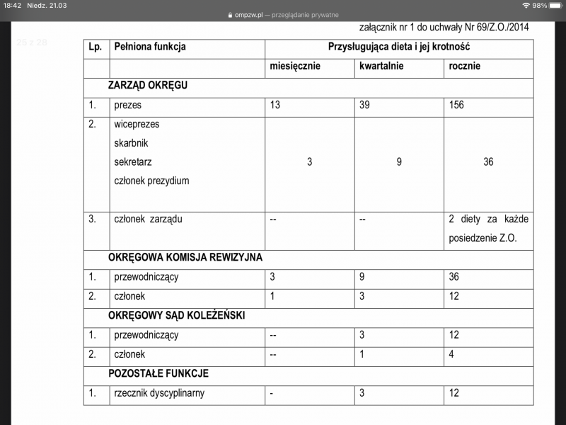 vako Opublikowano 21 Marca 2021 Zgłoś Udostępnij Opublikowano 21 Marca 2021 (edytowane) Chwilę nad tym posiedziałem i przypadku diet ZG wszystko jest jasne. Każda uchwała w tym temacie jest dostępna na stronie którą zalinkowałem. Trzeba przejrzeć ok 500 uchwał Prezydium i ZG, by mieć ciągłość do dnia dzisiejszego. Od początku kadencji wysokość i ilość diet przypadająca na członka ZG się nie zmieniła. Corocznie jest aktualizowana uchwałą ZG PZW w grudniu. Do tego jest tzw. premia świąteczna, w której wysokość jednej diety wyniosła odpowiednio:grudzień 2017- 650pln dla władz i 540 dla organów(Uchwała nr 14/XII/2017),grudzień 2018- 650pln dla władz i 540 dla organów(Uchwały nr 93 i 94/XII/2018),grudzień 2019- 670pln dla władz i 550 dla organów(Uchwały nr 206 i 209/XII/2019),grudzień 2020- 720pln dla władz i 600 dla organów.(Uchwały nr 280 i 288/XII/2020).....W załączniku jest uchwała z 2017 roku, a w niej wysokość diet i ilość przypadająca na okres jednego miesiąca lub kwartału na poszczególne funkcje w ZG, GKR, GKS. Uchwała ta jest aktualna do dziś.DietyPZW2017.doc Edytowane 21 Marca 2021 przez vako Cytuj Odnośnik do komentarza Udostępnij na innych stronach Więcej opcji udostępniania...