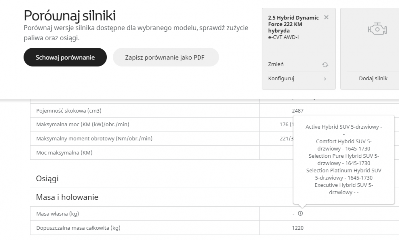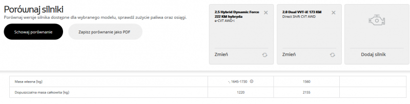 coma Opublikowano 27 Lutego 2019 Zgłoś Udostępnij Opublikowano 27 Lutego 2019 (edytowane) @coma szczerze, to sugerowałem się tym co mówił sprzedawca, nie porównywałem parametrów na papierze. A dopytywałem właśnie o wersje z hybryda i max wyposażeniem czyli min szklanym dachem. A tak jak mówiłem - facet trochę nas zna i wie co robimy z autami. Pamięta też jak nad Sanem odmówiła posłuszeństwa poprzedna wersja ravki z hybryda - a umówmy sie - w teren to ona średnio się nadawała.Trochę mnie zastanawia tak mała różnica w masie, sam silnik z racji pojemności i osprzętu waży zazwyczaj więcej, do tego klamoty zwiazane z hybrydaMi w konfiguratorze wychodzi ze różnica w masie auta to od 100 do 200 kg.Tak że ja to pewnie 2.0 Pb - po 5 latach podtlenek LPG do tego ..żeby mieć najbardziej ekologiczny napęd i spokój ..ale to odległe palny Zgoda - coś chyba wczoraj źle różnicę w masie sprawdziłem ale i tak wychodzi mi trochę inaczej niż Tobie. Przyjmując porównanie najlżejszej opcji wychodzi różnica 85kg a w wersjach najcięższych 60kg.Masy dla wersji Executive:Benzyniak 1560/1670Hybryda 1645/1730 Natomiast szklany dach (pakiet SkyView) nawet w najwyższej wersji wyposażenia Executive jest opcją dodatkową za którą trzeba dopłacić około 7tys. i stąd wynikało moje wczorajsze pytanie czemu zakładacie, że jak hybryda to od razu szklany dach idzie w parze. Wiem też, że poprzednia wersja hybrydowej Ravki średnio sobie radziła w terenie ale ponoć nowa ma być mocno poprawiona pod tym względem. To jest mój największy znak zapytania, dlatego zaczekam aż pojawią się jakieś testy w terenie albo będzie można odbyć jazdę próbną modelem 2.5 Hybrid Dynamic Force 222 KM e-CVT AWD-i i wtedy zdecyduję w którą iść stronę Edytowane 27 Lutego 2019 przez coma Cytuj Odnośnik do komentarza Udostępnij na innych stronach Więcej opcji udostępniania...