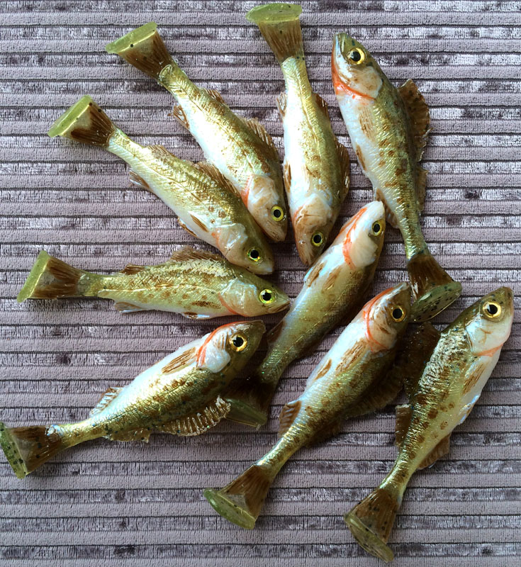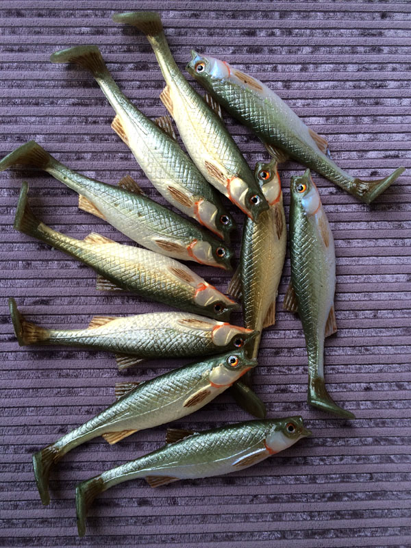 Janus Opublikowano 20 Kwietnia 2016 Autor Zgłoś Udostępnij Opublikowano 20 Kwietnia 2016 Poniżej prezętuję dwa warianty jazgarzy. Jeden nastroszony (10cm) i drugi z opuszczoną płetwą grzbietową (9 cm). Obok ukleje (12 cm) w dwóch opcjach kolorystycznych niebiesko perłowej i złoto perłowej. Obie wersje są rewelacyjne w wodzie. Wysyłają refleksy, które prowokują drapiżniki do ataku. Tródno powiedzieć, która z tych wersji jest bardziej łowna. Na jedną i drugą łapię potężne osobniki (85-110 cm) jeśli chodzi o szczupaka i sandacza. Przynęty te są zazwyczaj kompletnie wchłonięte, co znaczy że ryby uważają je na 100 % za prawdziwe. Skuszenie, szczególnie tych większych nie jest łatwe. One nie stały się tak duże bo rzucały się na jakikolwiek objekt. Są poprostu niesłychanie ostrożne. Poza wyglądem i poruszaniem się, uv aktywnymi barwami dodatkowo każda rybka ma swój specyficzny zapach - czosnku i ryby. Ważną rzeczą są też skrzela pomalowane (czasami lekko przesadnie) farbą reagującą na ultrafiolet. Jak wiadomo krew świeci w swietle uv i to dodatkowo przekonuje sceptyczne osobniki do ataku. 11 Cytuj Odnośnik do komentarza Udostępnij na innych stronach Więcej opcji udostępniania...