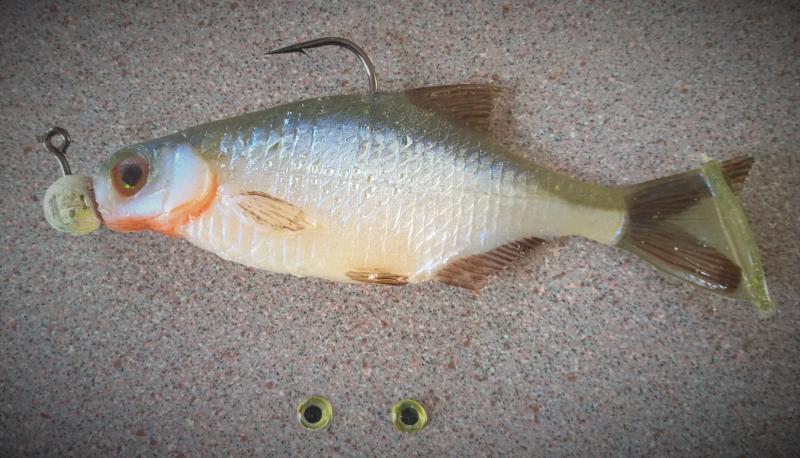 Oczy są przyklejane jedynym kleiem który naprawdę trzyma (Permabond 792). Do tej pory nie miałem żadnych problemów z odklejaniem się oczu. W niektórych rybach (szczególnie płaskich jak w tym wypadku leszczyk) trzeba koniecznie stosować się do instrukcji i używać wężyka termokurczliwego bo poprostu najlepszy klej nie jest w stanie wytrzymać grubości wpychanego ołowianego kołnierza.
