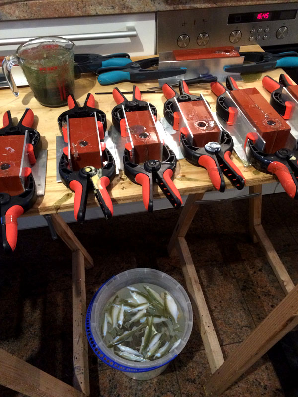 No niestety tak się rybkom trafiło. To są formy z termokauczuku, ale w tej chwili dałem te najlepsze przynęty do scanowania w 3D. Jak zrobią daje natychmiast do zrobienia matryc w alu. Wtedy mogę zaprojektować kilka gniazd i nie ma niebezpieczeństwa, że przy wtrysku plstisol wystrzeli. Na samym początku miałem taką przygodę. Tak szybko nie ściągałem nigdy z siebie ubrania.