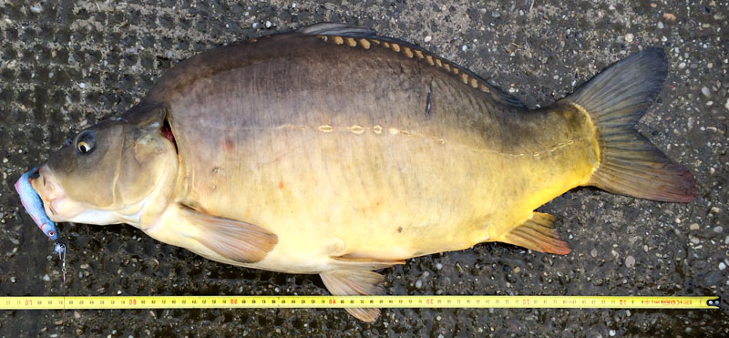 Tak, ten karp rybojad 6,4 kg, niecałe 70 cm załapał się na moją 11 cm ukleje blue, bezczelnie trzymając ją w pysku.