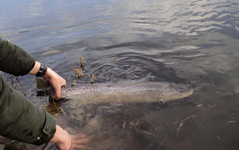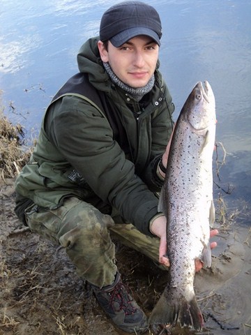 Troć połakomiła się na 6 cm woblerek Kenarta. Co ciekawe, najpierw wyszła mi do innego woblerka kilka godzin wcześniej - prawie wyskoczyła za nim w powietrze, zobaczyłem tylko rozwartą paszczę i plusk dużego ogona. Ryba stała na krawędzi rynny oddalonej od brzegu na którym stałem o ok. 3 metry. Przez 40 minut dokładnie obławiałem to miejsce, ale bez rezultatu. Wracając już do samochodu postanowiłem rzucić jeszcze w tym miejscu, tak na wszelki wypadek. Za trzecim rzutem przytrzymanie, wygięty kij i gwizd kołowrotka, hol trwał ok. 2 minut. Po szybkiej sesji fotograficznej ryba wraca z powrotem do wody, a ja pękam ze szczęścia - ochrzciłem nowy kij, z którym byłem pierwszy raz na rybach, przełamałem złą passę i sprawiłem sobie świetny prezent na wczorajsze urodziny.