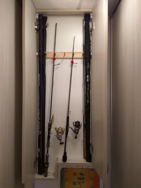 I tak pewnego dnia wpadła mi do głowy myśl, aby w garderobie na pustej, niewielkiej ścianie pomiędzy dwoma szafami zamontować szafkę na wędki. Szafka jest szeroka na 50 cm. Spokojnie mieści kilka moich batów i maksymalnie 4 gotowe zestawy z kołowrotkiem w razie potrzeby.