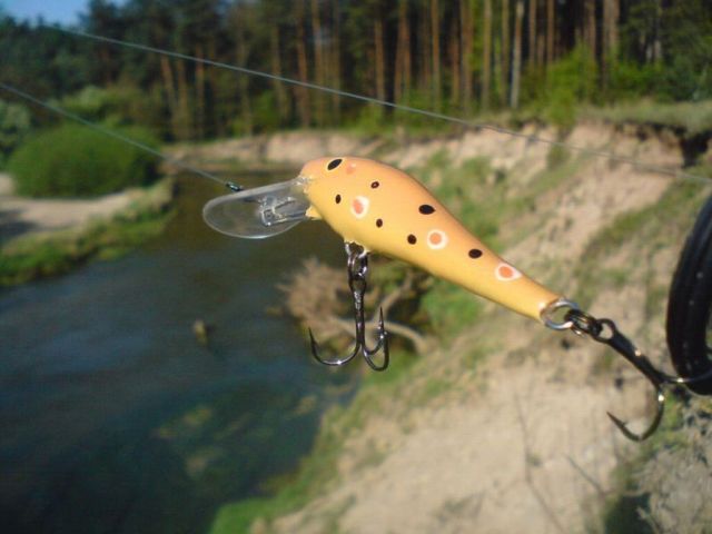 Rutt Opublikowano 6 Maja 2008 Zgłoś Udostępnij Opublikowano 6 Maja 2008 Bardzo ładne woblerki ostatnio pokazaliście - Gratulacje i dużo brań na nie życzę. Pokażę Wam fotkę z okoniem na mojego woblerka - okoń miał około 30cm (nie mierzony) i został złowiony przez mojego tatę. Cała sytuacja była troche zabawna, bo niebrało na nic, nikomu i dopiero jak założyłem tego woblerka, odrazu zaliczyłem branie - podejrzewam że był to okoń o podobnych gabarytach jak ten, jednak niestety spiął się. Jako, że był to pierwszy wyjazd z moim nowym kijem to po tej przygodzie dałem go tacie mówiąć: zobacz jak sprzęt chodzi po przejściu kilku metrów tata oddał rzut i złowił tego właśnie okonia. Potem nie brało już nic, ale była to lekcja która przekonała nas, że z przynętą trzeba trafić. wobler na tym zdjęciu wyszedł bardzo dziwnie, przez światło, dlatego wrzucę jeszcze fotkę samego woblerka: Chyba nikomu tutaj nie muszę mówić jak cieszy ryba na swoją przynętę... Odnośnik do komentarza Udostępnij na innych stronach Więcej opcji udostępniania...