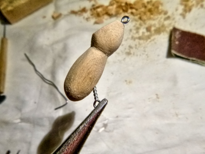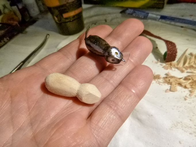 jaceen Opublikowano 14 Marca 2019 Autor Zgłoś Udostępnij Opublikowano 14 Marca 2019 Myszka.Trumienka z lipy 30 mm:) Obrabiam tułów i główkę. Dopieszczam kształt papierem ściernym.Oczka wklejam na klej sekundowy. Nacinam miejsce na ster i robię wgłębienia pod obciążenie. Pozostaje malowanie, piórko wiadomo gdzie:))), zbrojenie i pretekst by wyrwać nad wodę 70 mm czarnego zygzaka pod okonie. Myślę, że z uzbrojeniem waży nie więcej niż 6 g. Dziubek na wierzchu. cdn. 20 Cytuj Odnośnik do komentarza Udostępnij na innych stronach Więcej opcji udostępniania...