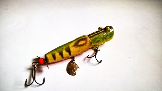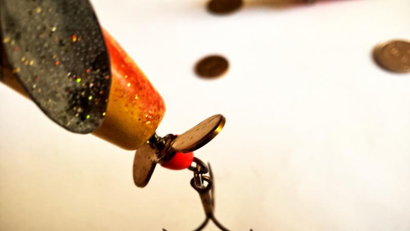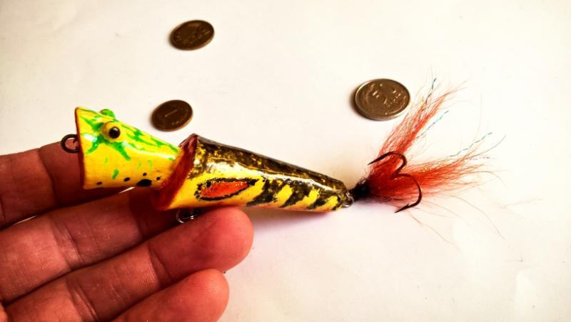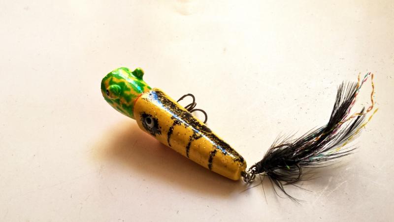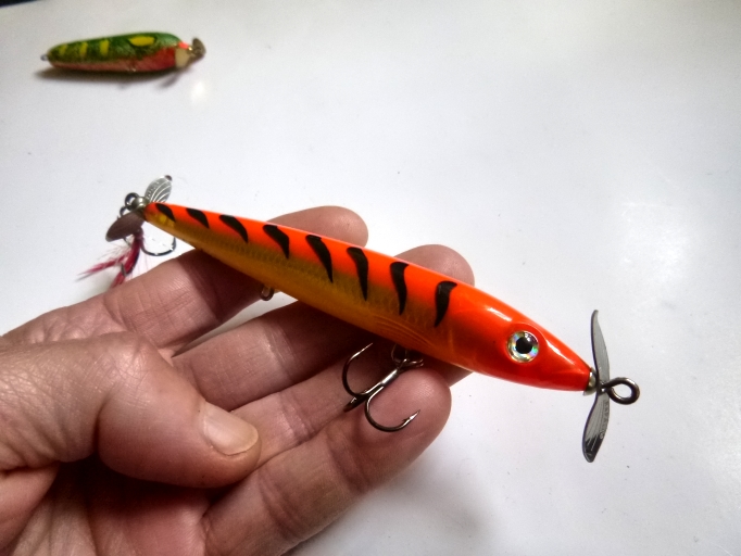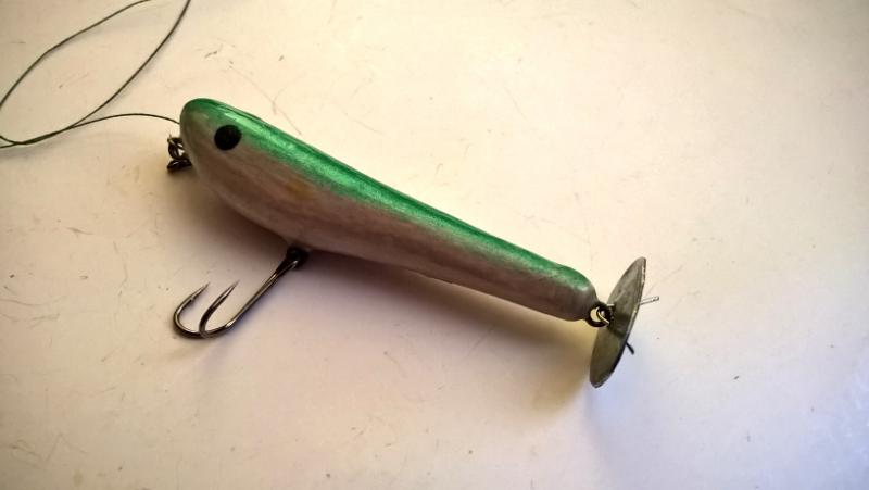 jaceen Opublikowano 16 Lipca 2020 Autor Zgłoś Udostępnij Opublikowano 16 Lipca 2020 1. Popper 8 cm, pływający, waga nn (ok 10g ?). Inspiracją jest wobler firmy Jackall.Lipa, wkręty, podkład-akryl, malowanie kredkami Koh-I-Noor, dwie warstwy akrylu w sprayu i na to jedna warstwa żywicy epoksydowej.2. "Banan" wtd 7 cm, materiał i malowanie w podobny sposób. Popper pracuje w typowy dla takich przynęt sposób. Plumpka:), czy też robi BLUUM! Można prowadzić jednostajnie.Śmigiełko zrobi zamieszanie i nie jest to ciche ślizganie się po powierzchni. Udało się uzyskać tak jak w oryginale, pracę "wtd". Wirujący ogonek dla dodatkowych impulsów. 8 Cytuj Odnośnik do komentarza Udostępnij na innych stronach Więcej opcji udostępniania...