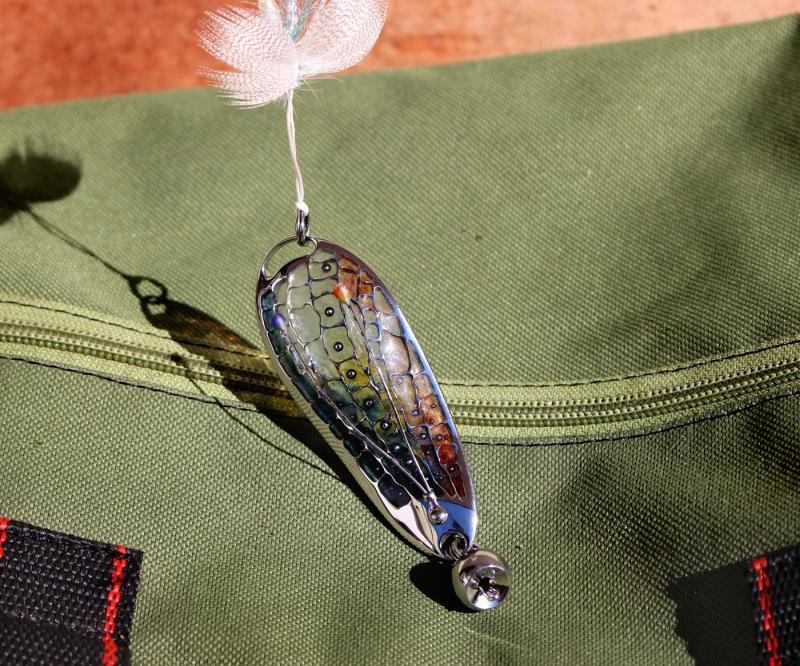 zahar Opublikowano 2 Sierpnia 2016 Autor Zgłoś Udostępnij Opublikowano 2 Sierpnia 2016 Efekt zakładu.A poszło o to, że duże cykady wyrywają kij przy trolu.Trochę w pośpiechu, bo przecież zakład, trochę na żywioł, co widać. A brałem też pod uwagę, że te cholery mnie podpuściły.I zrobił się taki Chaos. W tym, głowa-oko już ma fakturę, prawie bliską oku owada, szkoda, że prawie.Korpus nitowany ze skrzydłem, oko na sztyfcie, dwa materiały, nierdzewka i kompozyt (traktuję go jako jeden). Skrzyło dł. 70 mm, waga 14 gr.Nawet dobrze płynie, miękko,tylko, wieczorem trzeba uważać, bo robactwo spieprza na drzewa. 32 Cytuj Odnośnik do komentarza Udostępnij na innych stronach Więcej opcji udostępniania...