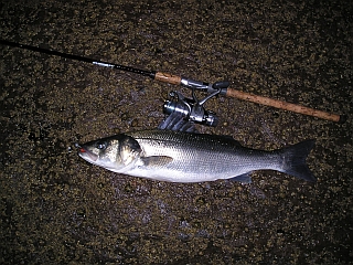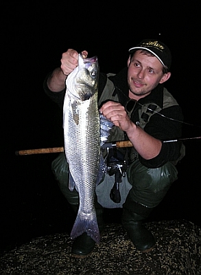 Bassy podeszły na 30 min. przed zmierzchem. Zobaczyłem kilka spławów ryb i zaraz poczułem delikatne branie, oczywiście na pomarańczowego Mannsa. Po zacięciu ryba jakby się chwilę zastanawiała co robić i ruszyła z takim impetem, że mało nie spadłem z głazu do wody. Po kilkunastometrowym odjeździe po prostu spadła...A spadła dlatego, że wyprostowała hak mojej główki (Sasame Nr 1). Następna ryba po zacięciu wjechała w zielsko na dnie i niestety po kilku minutach szarpaniny zerwałem żyłkę.