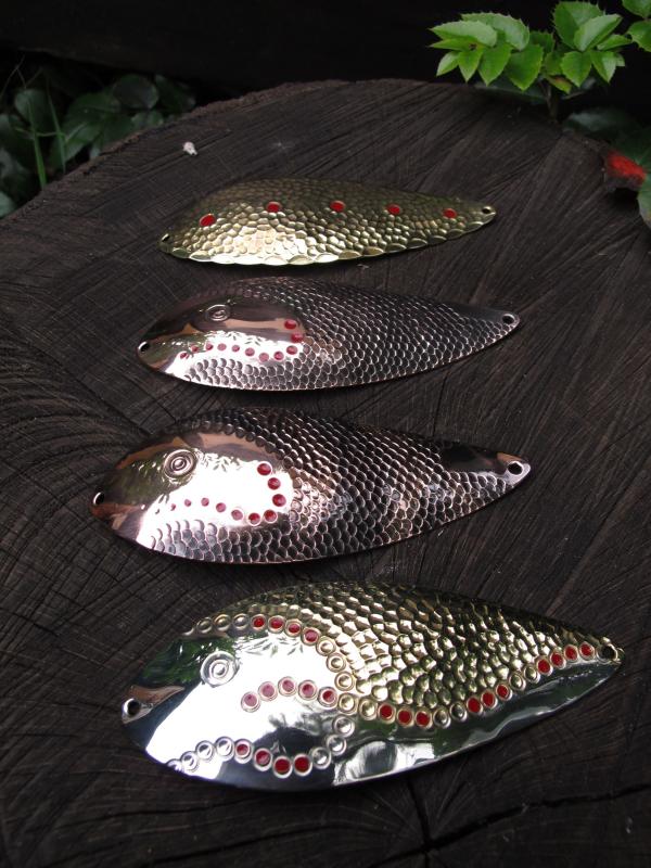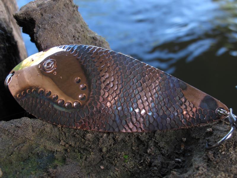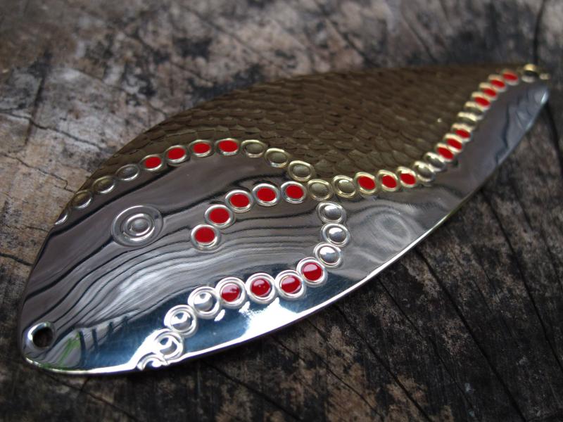To są moje spostrzeżenia, możesz mieć inne. Generalnie na czystej wodzie z dużą presją spiningistów chromy odstają od naturalnych odcieni blachy jako surowca. Woda mocno przebłyszczona. Świetnie za to reagują sandacze na naturalne oblewy cynowe, srebrzone, patynowany mosiądz. Ulubione - drapana miedź rewers polerowana cyna, srebro awers. Co woda to inny obyczaj. Fajnie można uatrakcyjniać blachy miedziane poprzez swoje ornamenty. Wystarczy pozwolić blasze lekko zatłuszczonej nabrać patyny w okresie np. tygodnia mocząc ją i pozostawiając na powietrzu. Po tym okresie wykleić folią w paski, kropki i przetrzeć mleczkiem polerskim do miedzi lub metalu. Całość spłukać pod bieżącą wodą i wytrzeć do sucha. Mamy patynę z przebłyskami metalu polerowanego. Drugi sposób to nakładanie brokatu na wcześniej posmarowane punktowo miejsca epoxy. Brokat sypiemy jak z solniczki, różne kolory. Po zastygnięciu i wykruszeniu luźno trzymających się ziaren zostaje trwały ornament z fakturą. Jeśli jest to blacha miedziana patyna miedzi w połączeniu z w/w zdobnictwem daje bardzo ciekawe efekty w wodzie, mikro rozbłyski, coś jak skaleczony pstrąg, lin, lipień. Słowem dobra zabawa.